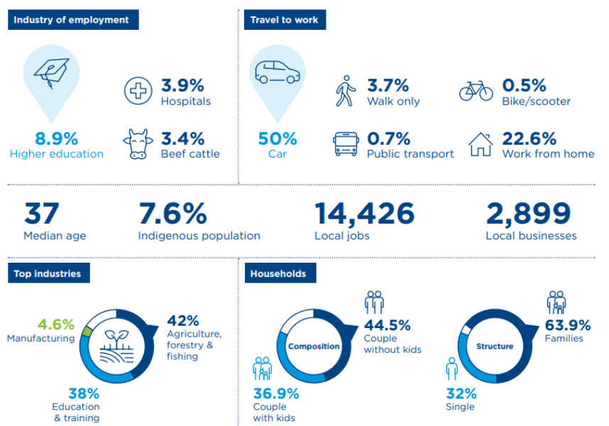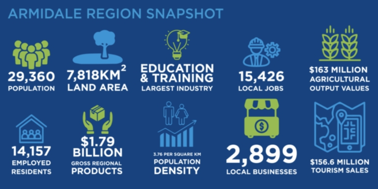 The Armidale region has a thriving small business sector and boasts a highly diverse industry base and a variety of well-established key employment divisions. Around 2,899 local businesses in the Armidale region contribute to a gross regional product valued at $1.79 billion (2022) and tourism continues to play an important role as an economic driver, with tourism sales estimating $156.6 million.